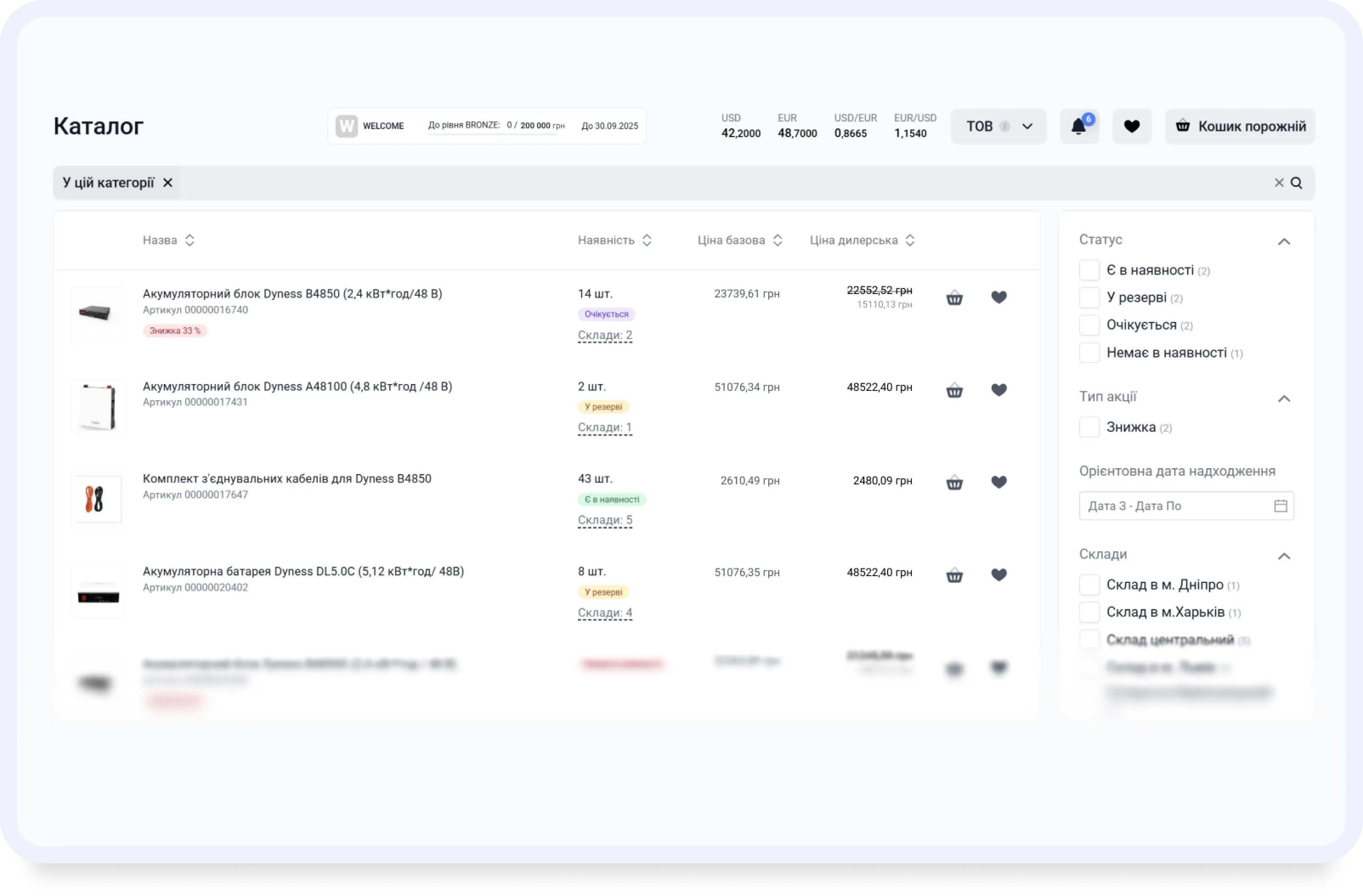 Весь актуальний залишок по складах відображається в режимі реального часу у вашому кабінеті.